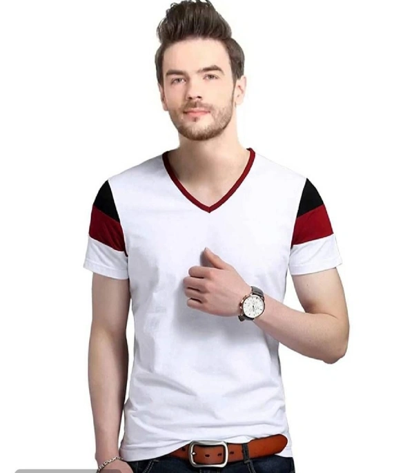 Stylish White Cotton Colourblocked V-Neck T-Shirt For Men